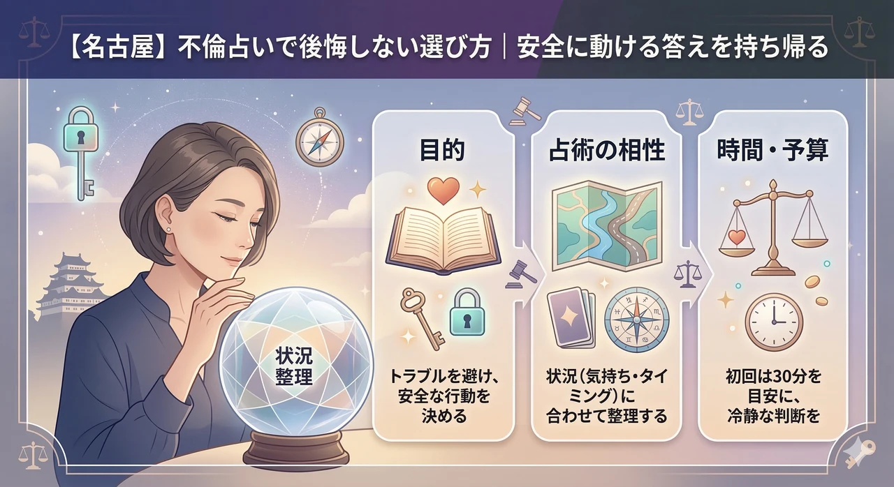 名古屋で不倫占いを考えるときは、最初から「当たる先生探し」だけに寄りすぎない方が後悔しにくくなります。大切なのは、今の状況を悪化させずに、次の一手を整理できるかどうかです。